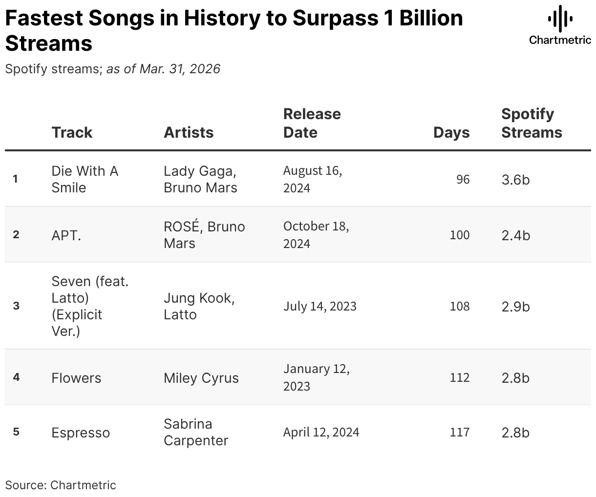 Spotify streams; as of Mar. 31, 2026