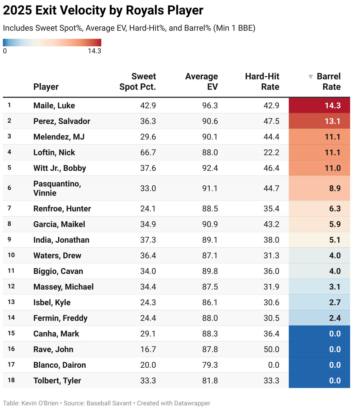 Includes Sweet Spot%, Average EV, Hard-Hit%, and Barrel% (Min 1 BBE)