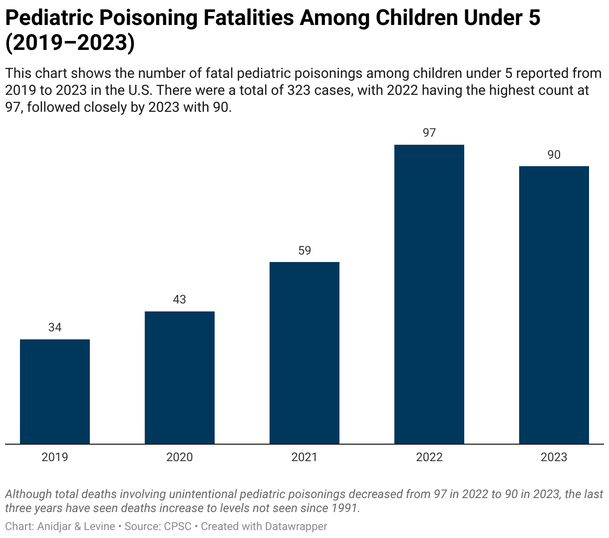 This chart shows the number of fatal pediatric poisonings among children under 5 reported from 2019 to 2023 in the U.S. There were a total of 323 cases, with 2022 having the highest count at 97, followed closely by 2023 with 90.