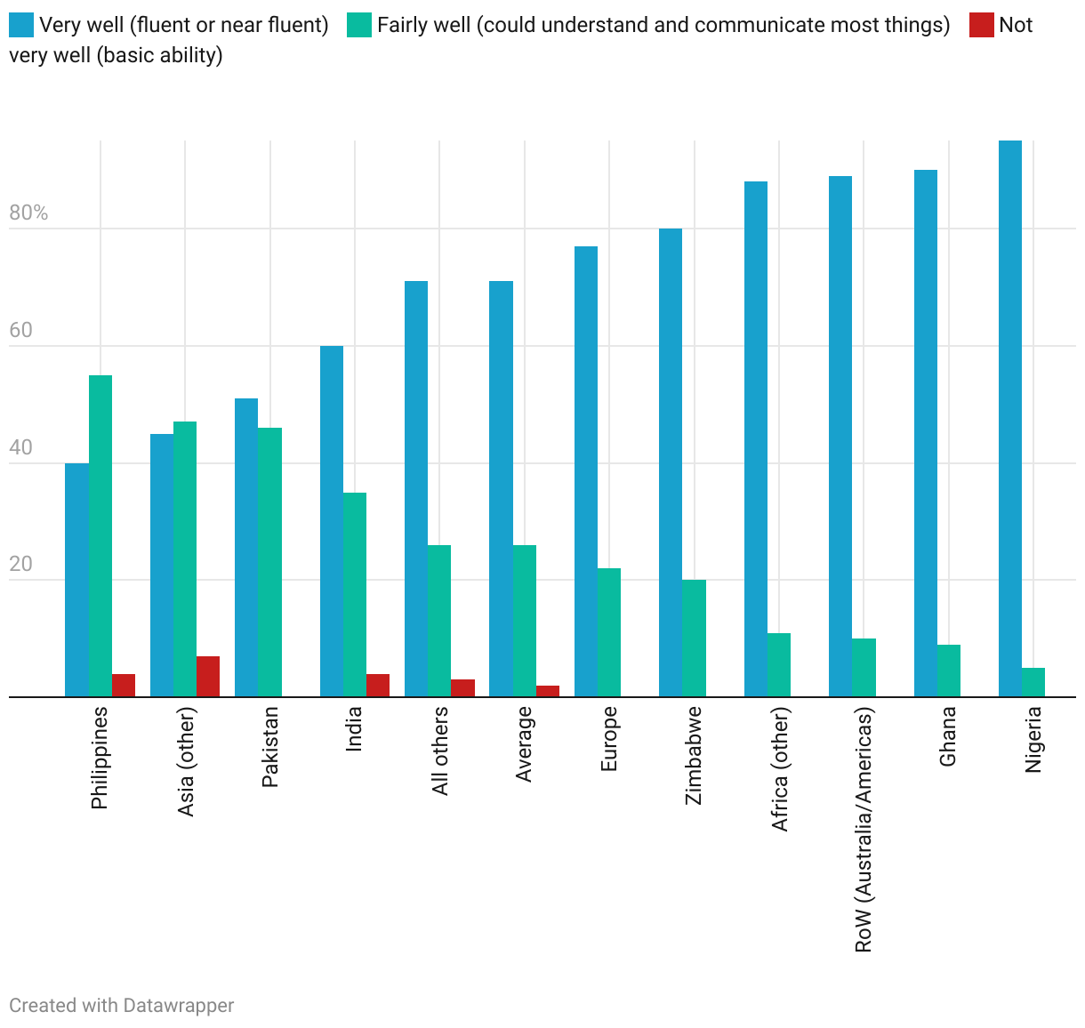 1. English Language proficiency levels of surveyed Skilled Worker main applicants and their partners before coming to the UK.