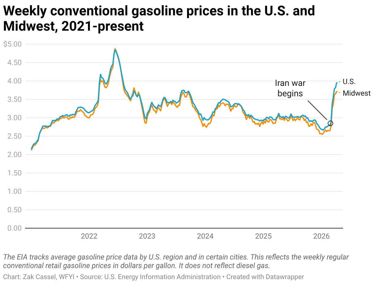 Weekly conventional gasoline prices in the U.S. and Midwest, 2021-present
