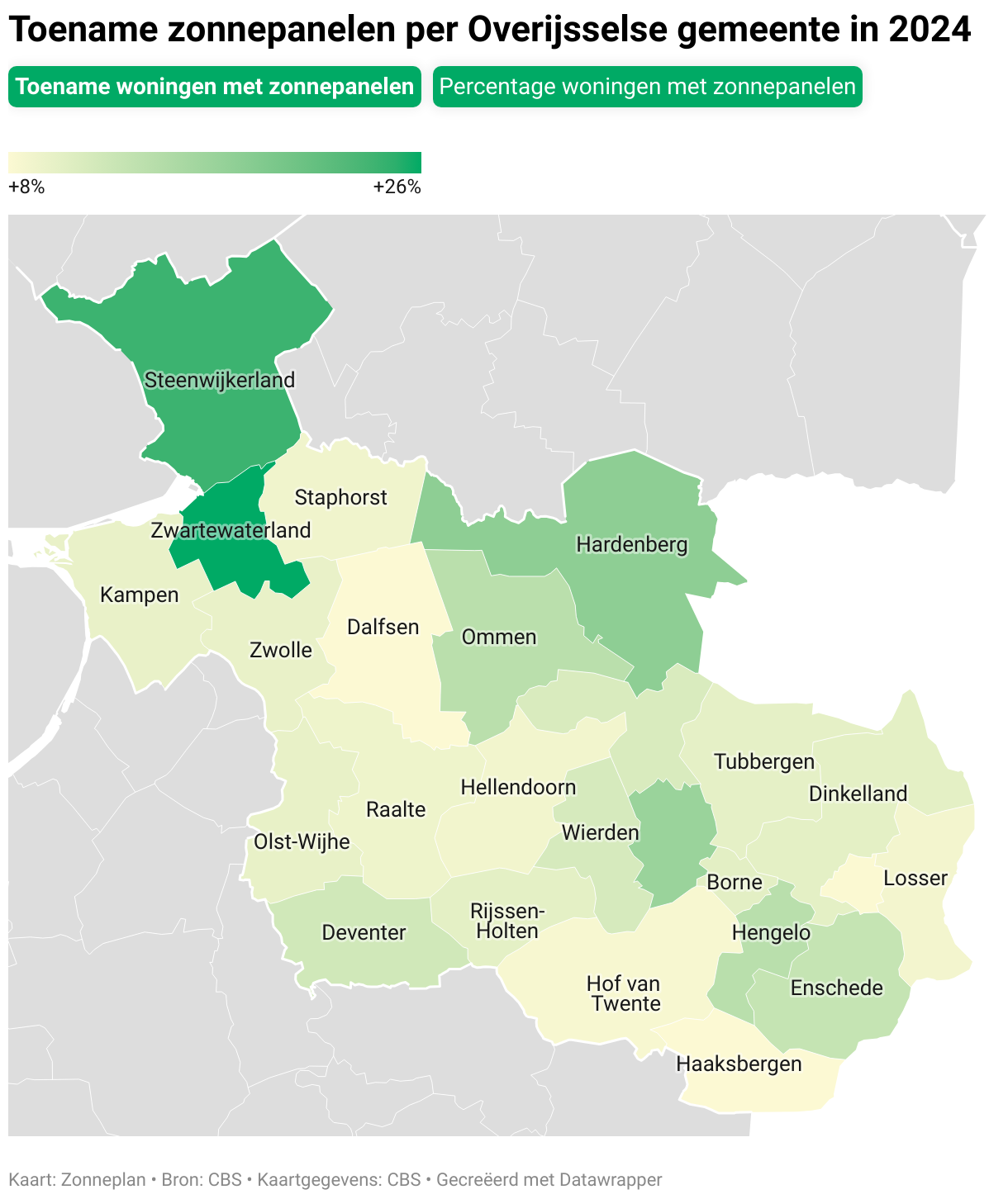 Toename zonnepanelen per Overijsselse gemeente in 2024