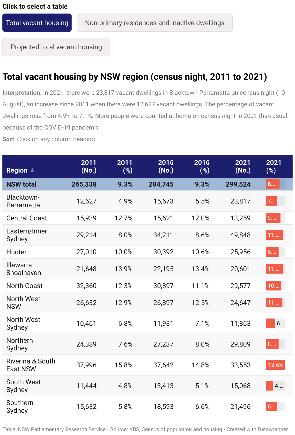 Total vacant housing by NSW region (census night, 2011 to 2021)