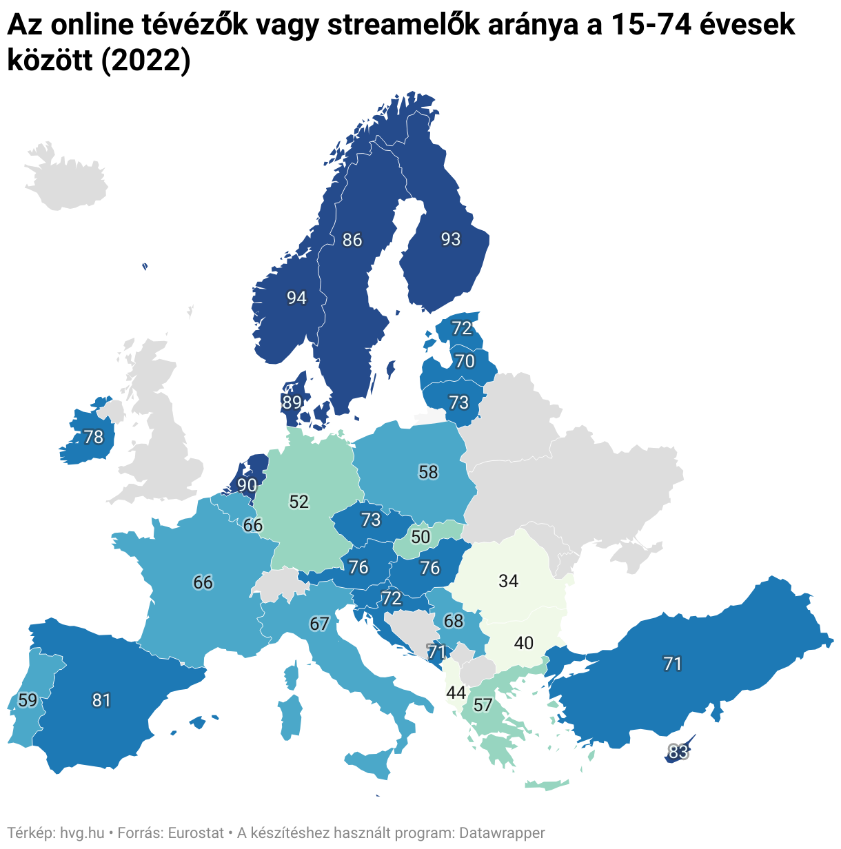 Az online tévézők vagy streamelők aránya a 15-74 évesek között (2022)