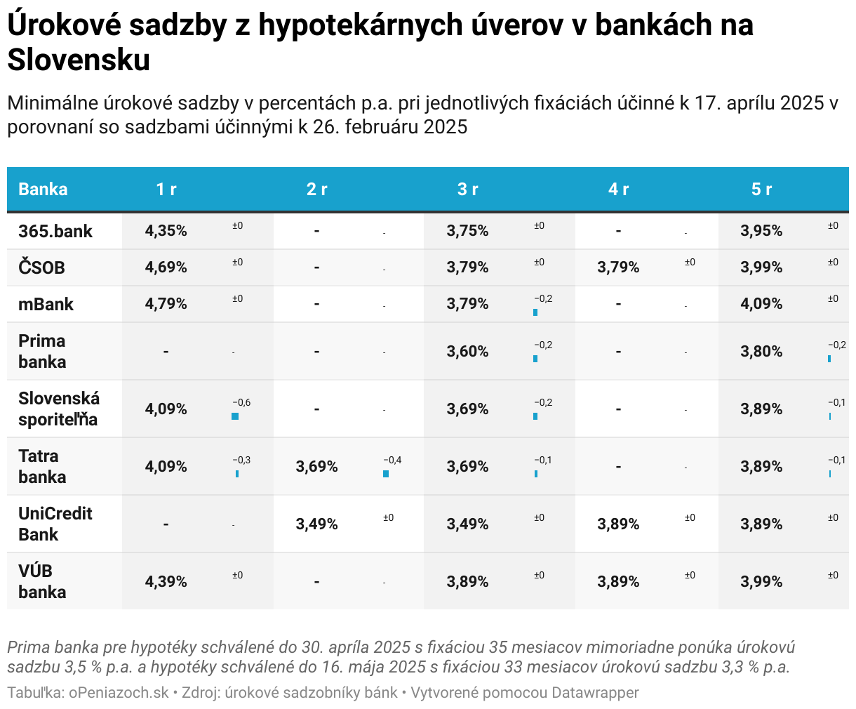 Minimálne úrokové sadzby v percentách p.a. pri jednotlivých fixáciách účinné k 17. aprílu 2025 v porovnaní so sadzbami účinnými k 26. februáru 2025