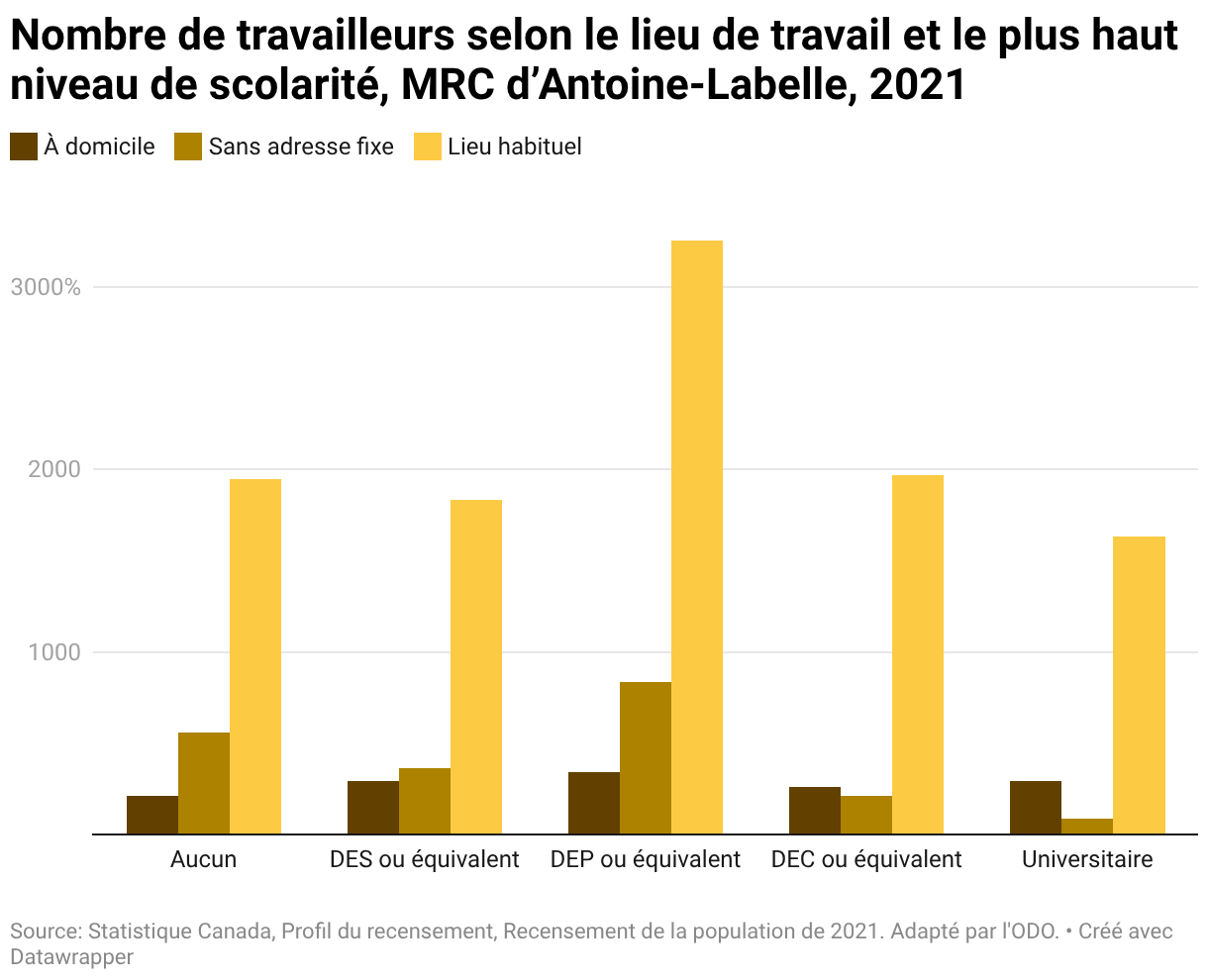Nombre de travailleurs selon le lieu de travail et le plus haut niveau de scolarité, MRC d’Antoine-Labelle, 2021