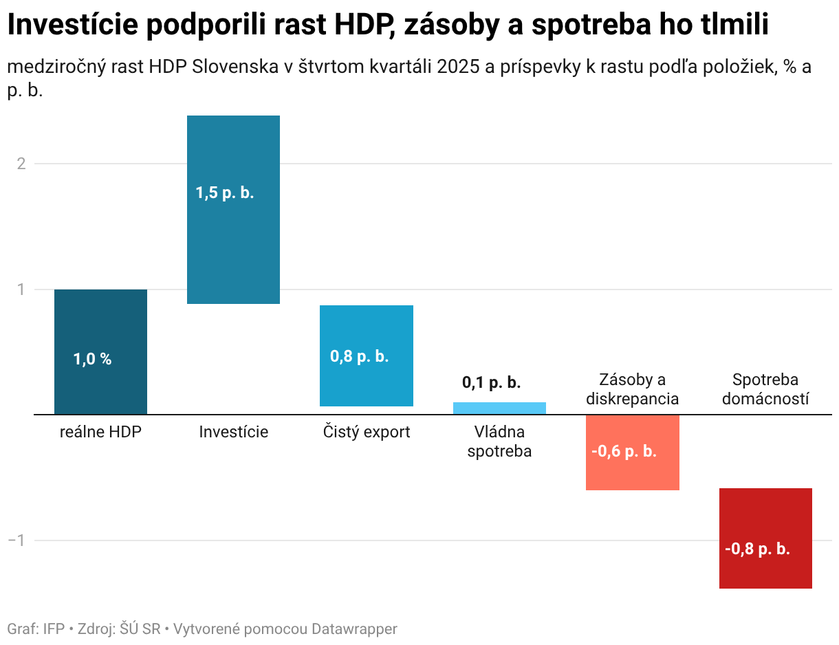 medziročný rast HDP Slovenska v štvrtom kvartáli 2025 a príspevky k rastu podľa položiek, % a p. b.