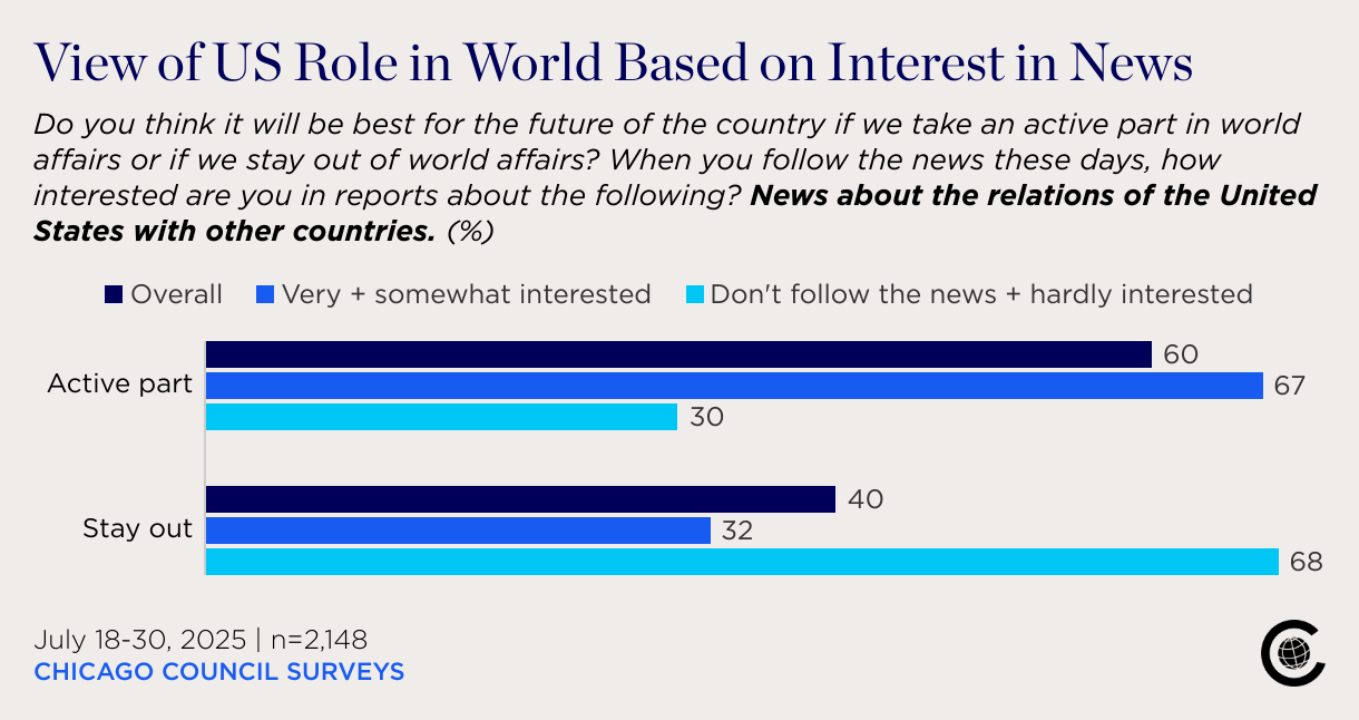 Do you think it will be best for the future of the country if we take an active part in world affairs or if we stay out of world affairs? When you follow the news these days, how interested are you in reports about the following? News about the relations of the United States with other countries. (%)