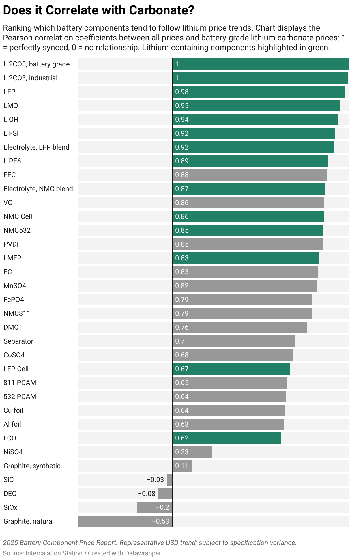 Ranking which battery components tend to follow lithium price trends. Chart displays the Pearson correlation coefficients between all prices and battery-grade lithium carbonate prices: 1 = perfectly synced, 0 = no relationship. Lithium containing components highlighted in green.