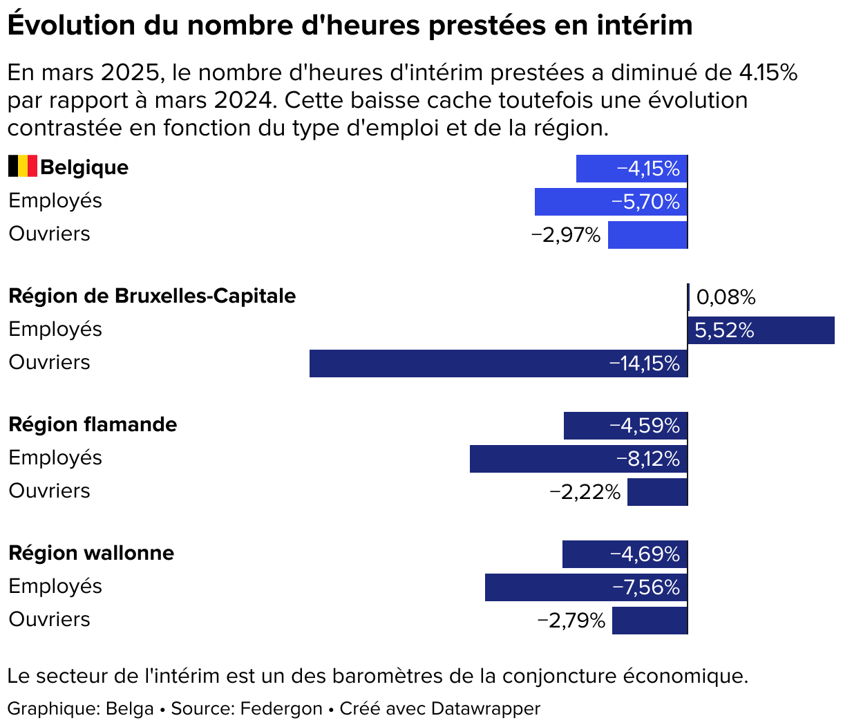 En mars 2025, le nombre d'heures d'intérim prestées a diminué de 4.15% par rapport à mars 2024. Cette baisse cache toutefois une évolution contrastée en fonction du type d'emploi et de la région.