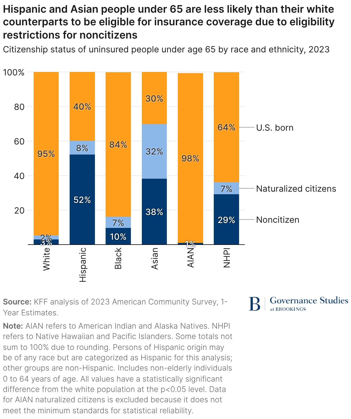 Citizenship status of uninsured people under age 65 by race and ethnicity, 2023