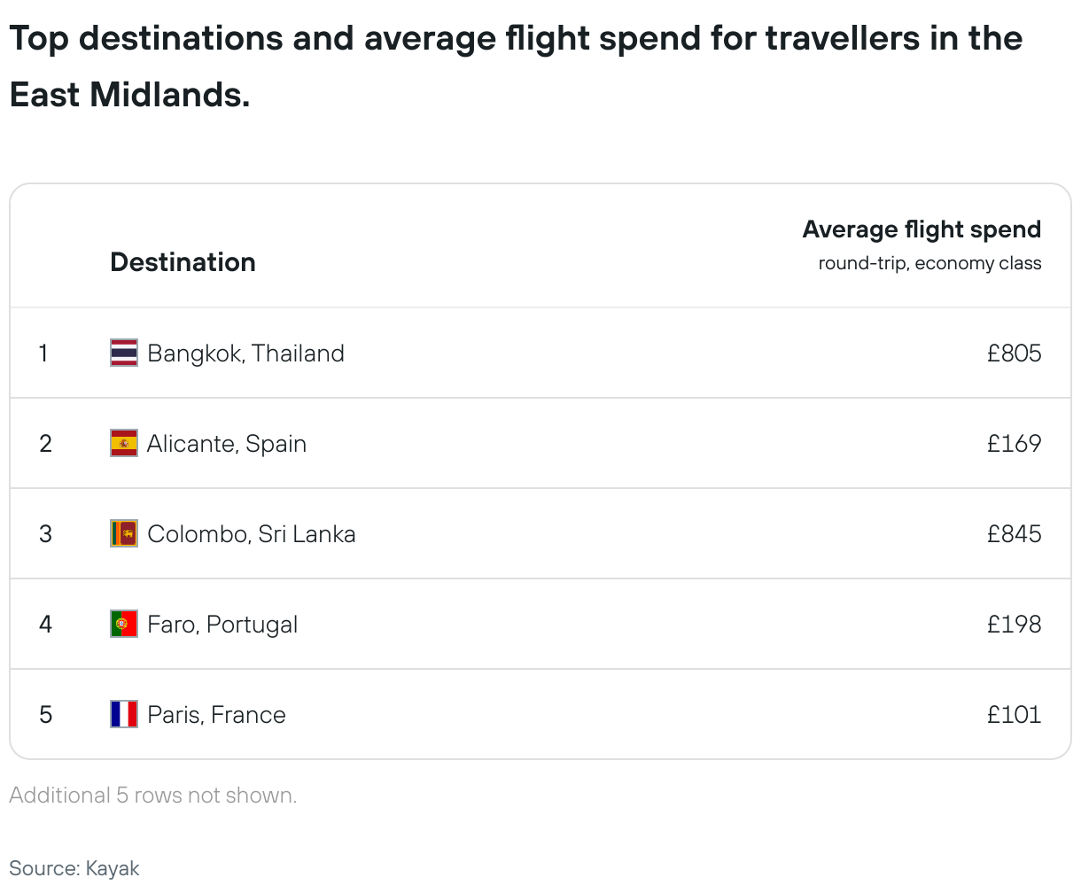 Top destinations and average flight spend for travellers in the East Midlands.