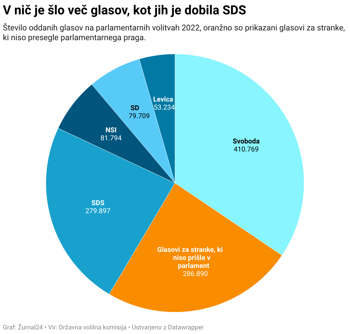 Število oddanih glasov na parlamentarnih volitvah 2022, oranžno so prikazani glasovi za stranke, ki niso presegle parlamentarnega praga.