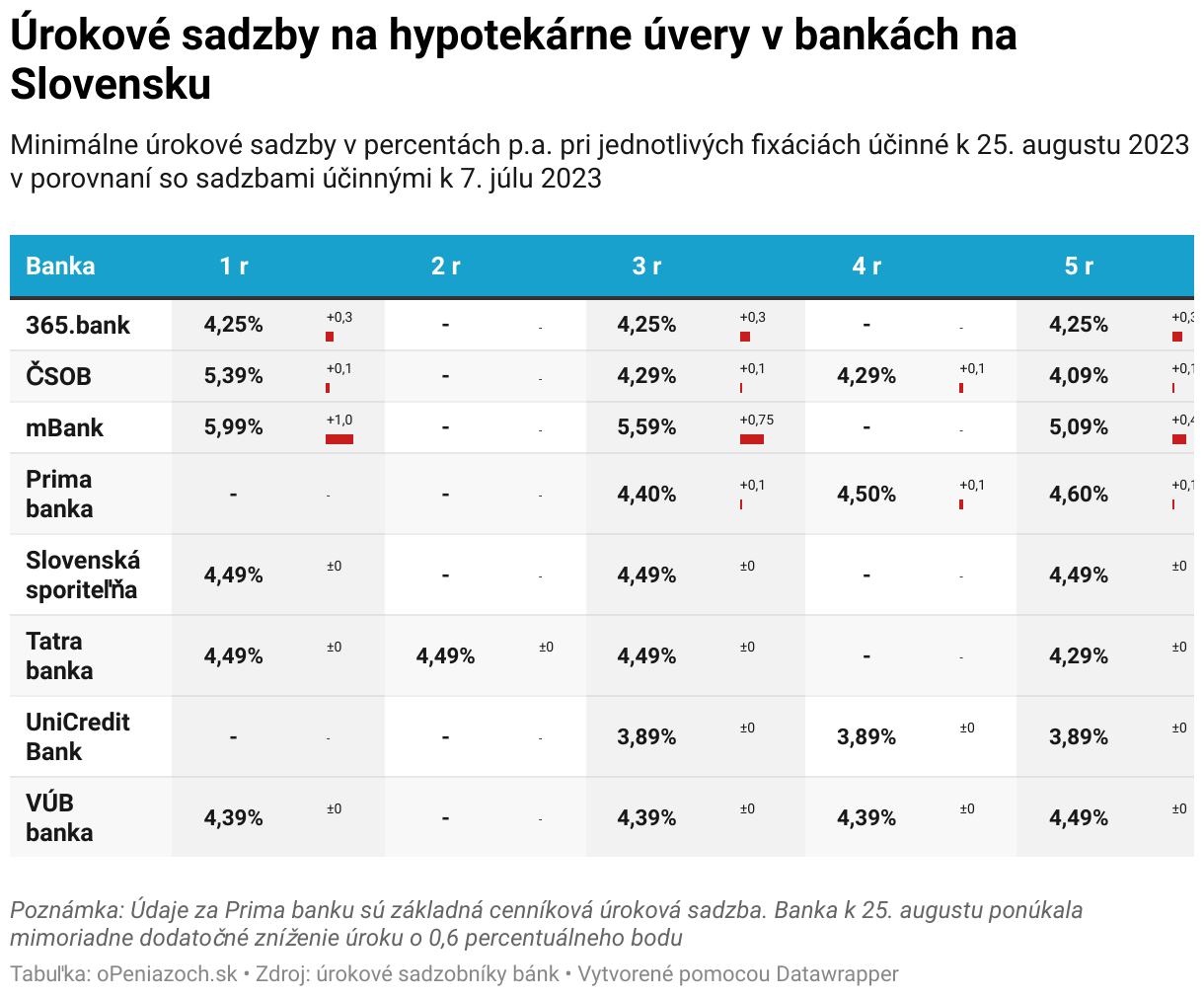 Minimálne úrokové sadzby v percentách p.a. pri jednotlivých fixáciách účinné k 25. augustu 2023 v porovnaní so sadzbami účinnými k 7. júlu 2023