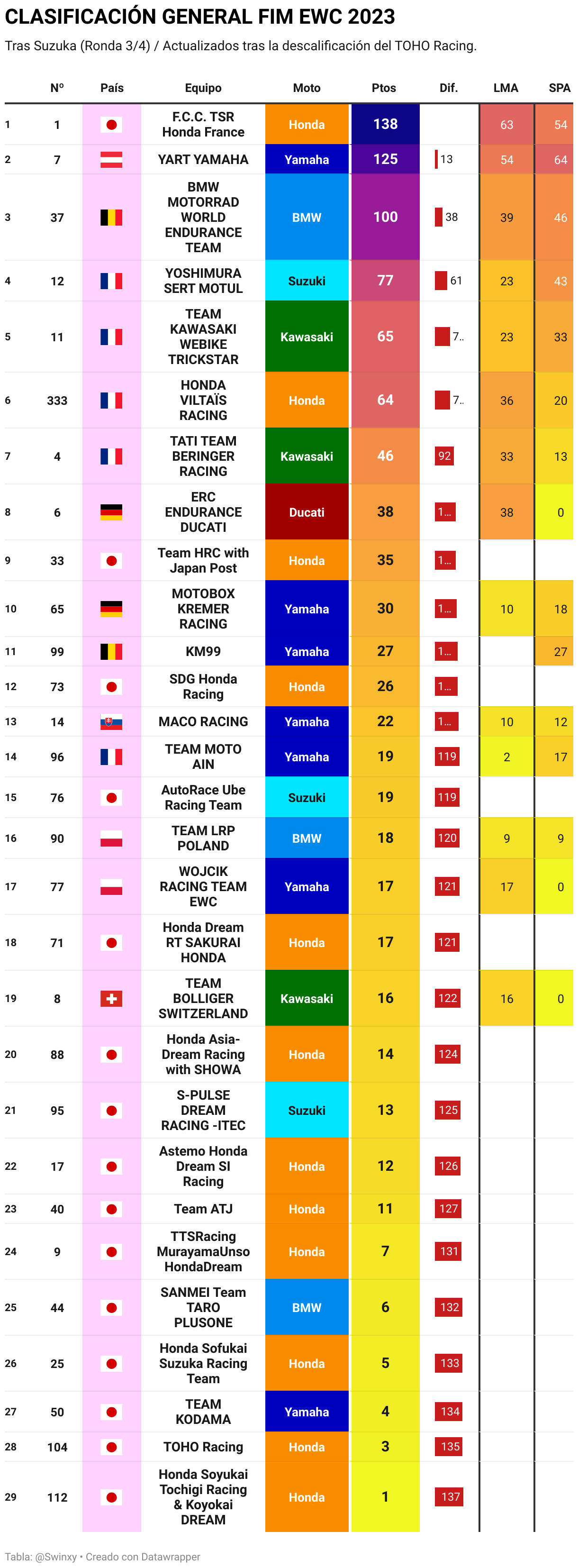 Tras Suzuka (Ronda 3/4) / Actualizados tras la descalificación del TOHO Racing.