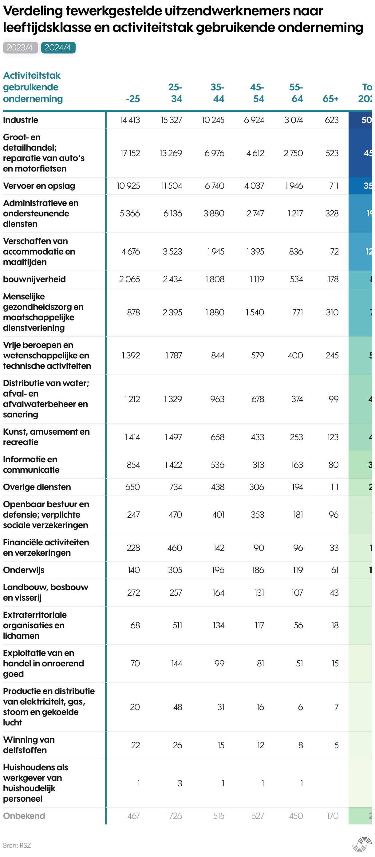 Verdeling tewerkgestelde uitzendwerknemers naar leeftijdsklasse en activiteitstak gebruikende onderneming
