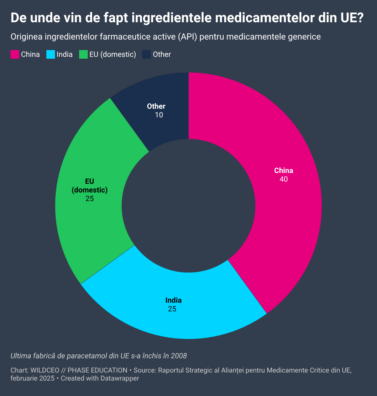 Donut chart showing the origin of Active Pharmaceutical Ingredients (APIs) for EU generic medicines. China and India supply over 60% of Europe's medicine ingredients, highlighting critical supply chain vulnerabilities in EU healthcare.