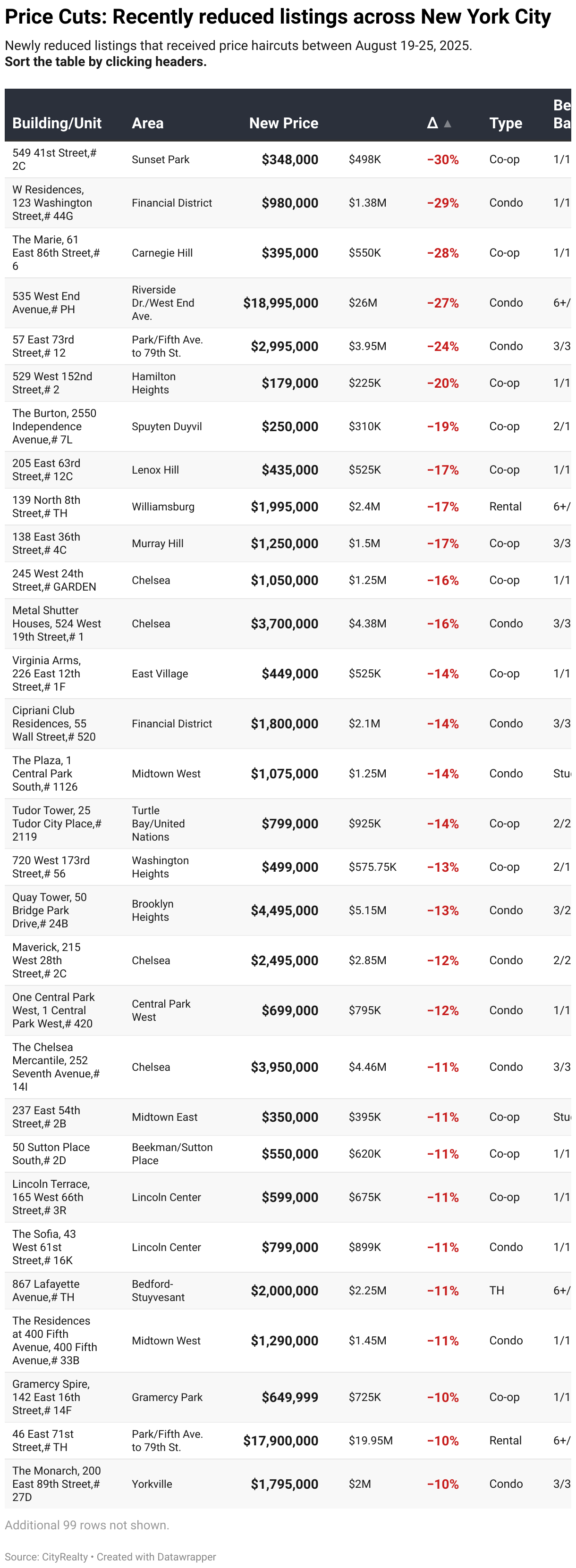 Newly reduced listings that received price haircuts between August 19-25, 2025. Sort the table by clicking headers.