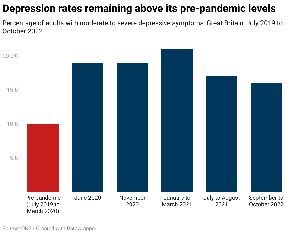 Percentage of adults with moderate to severe depressive symptoms, Great Britain, July 2019 to October 2022