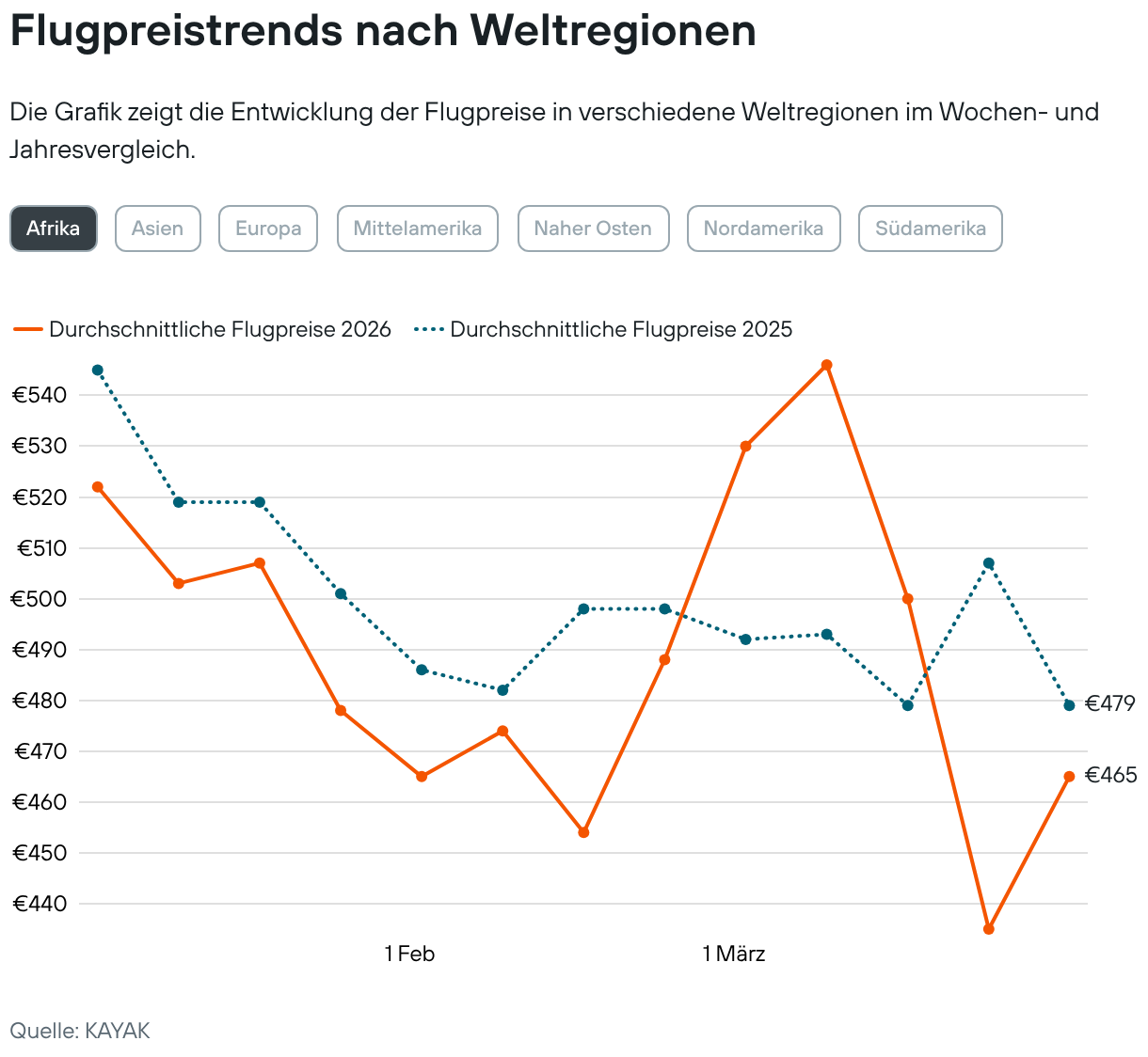 Flugpreistrends nach Weltregionen Die Grafik zeigt die Entwicklung der Flugpreise in verschiedene Weltregionen im Wochen- und Jahresvergleich. Afrika Asien Europa Mittelamerika Naher Osten Nordamerika Südamerika