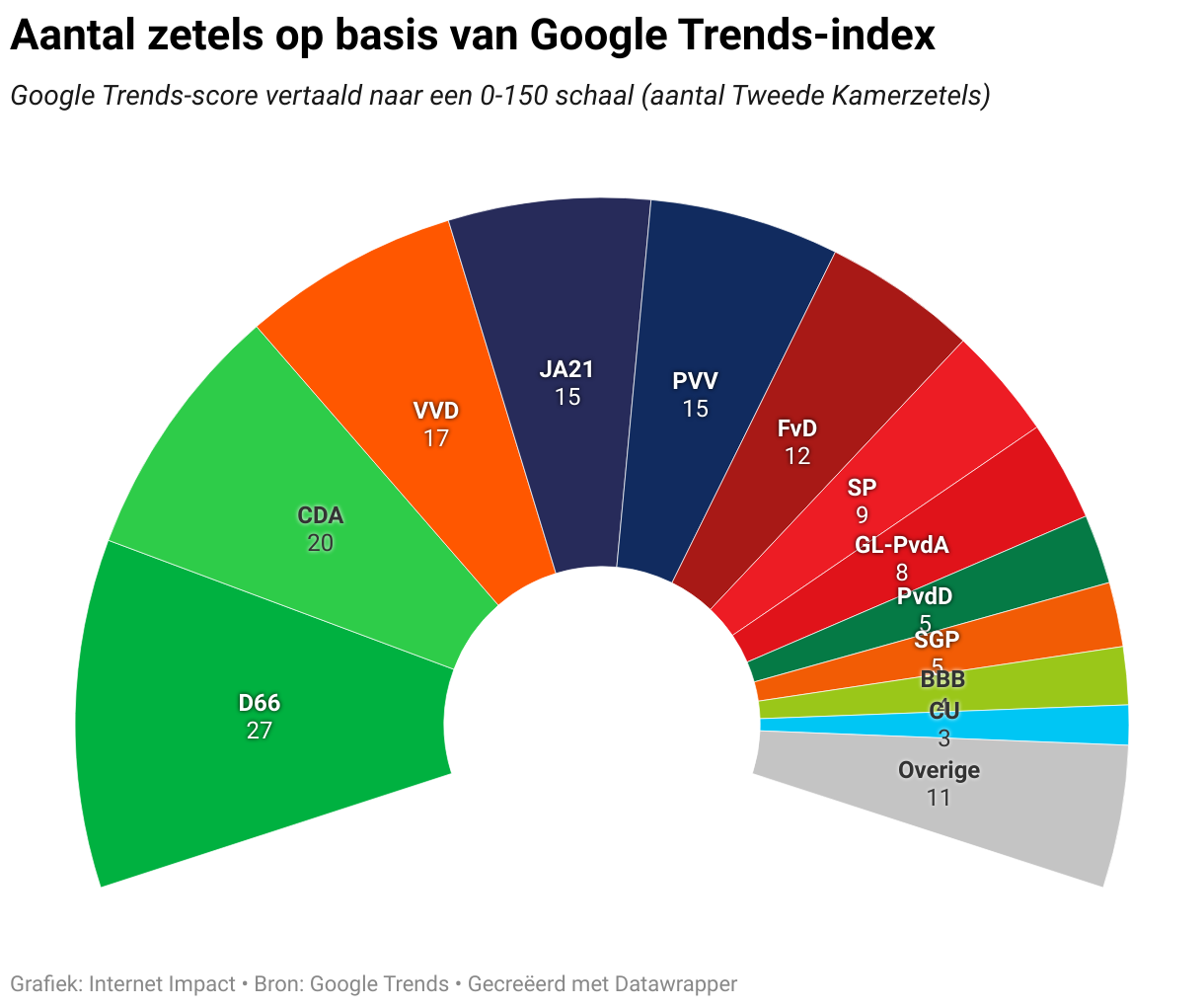 Google Trends-score vertaald naar een 0-150 schaal (aantal Tweede Kamerzetels)