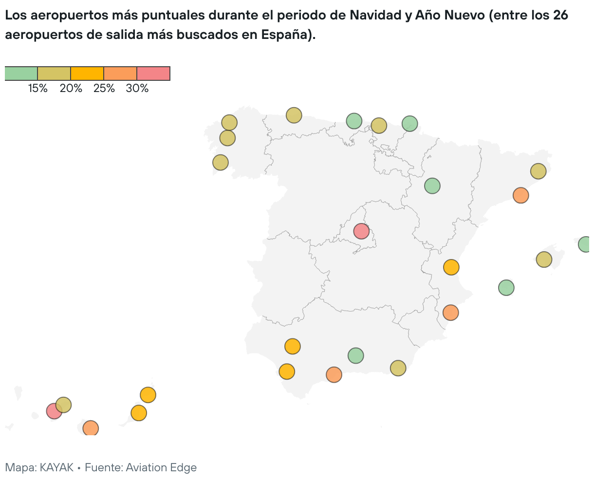 Los aeropuertos más puntuales durante el periodo de Navidad y Año Nuevo (entre los 26 aeropuertos de salida más buscados en España).