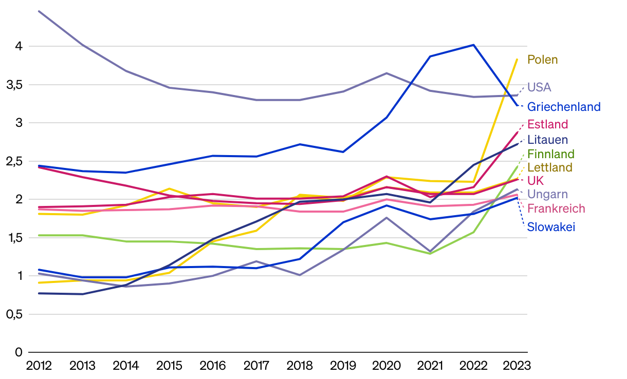 Ausgaben für Verteidigung in Prozent des BIP, 2012–2023