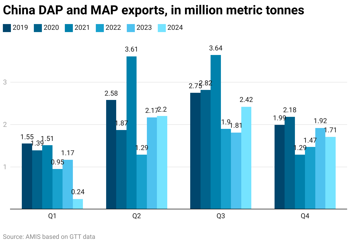 China DAP and MAP exports, in million metric tonnes