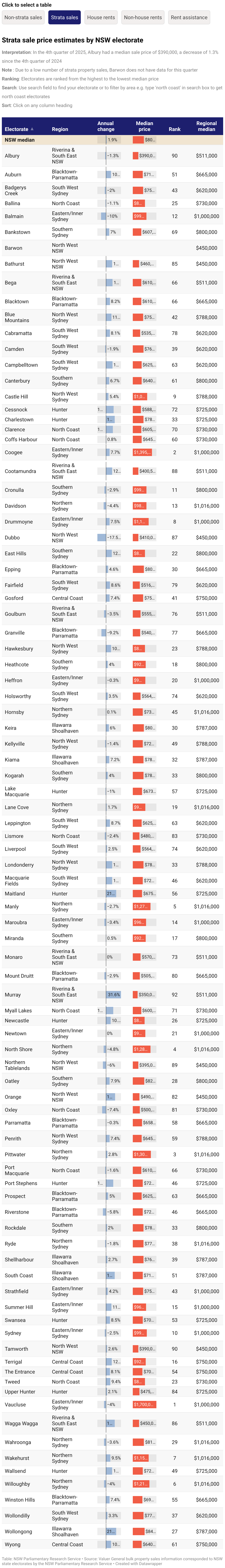 Strata sale price estimates by NSW electorate