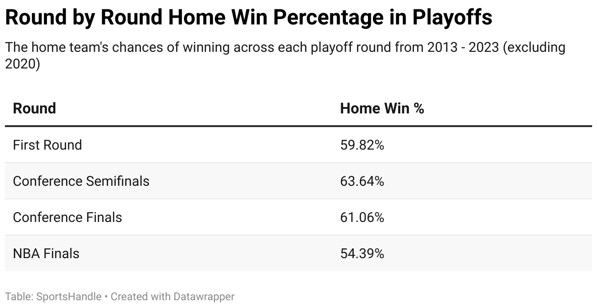 The home team's chances of winning across each playoff round from 2013 - 2023 (excluding 2020)
