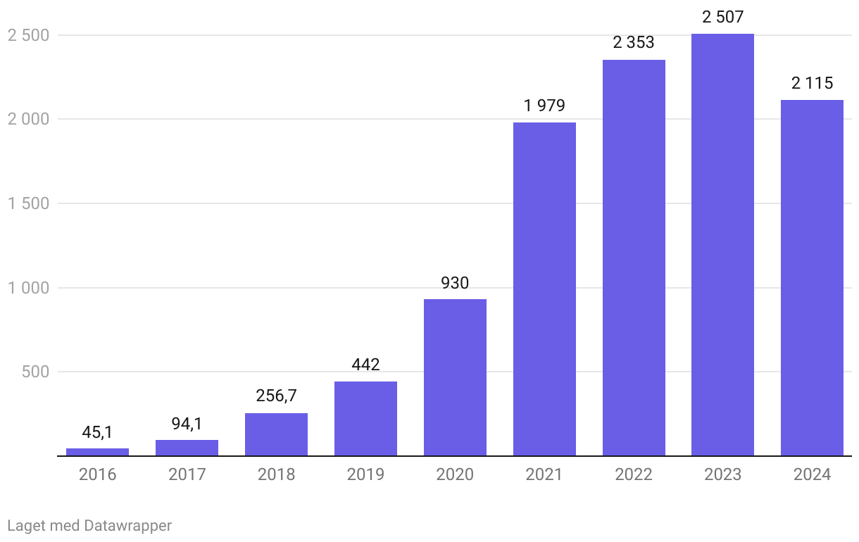 Etter åtte år med vekst peket pilene nedover for norsk folkefinansiering. Tall i millioner kroner.