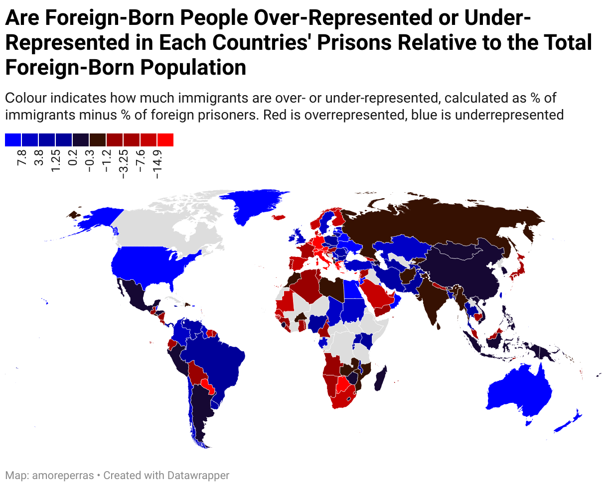 Сolour indicates how much immigrants are over- or under-represented, calculated as % of immigrants minus % of foreign prisoners.