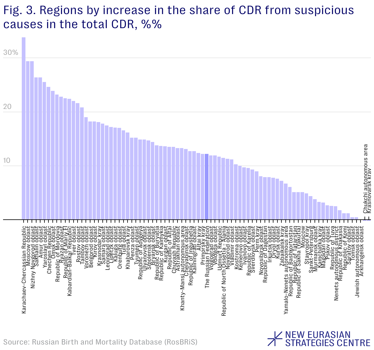Fig. 3. Regions by increase in the share of CDR from suspicious causes in the total CDR, %%