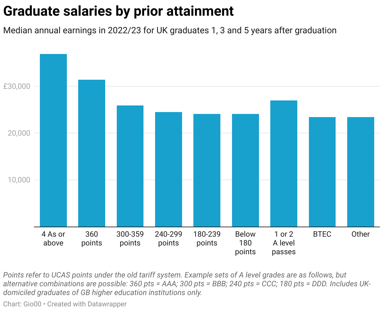Median annual earnings in 2022/23 for UK graduates 1, 3 and 5 years after graduation