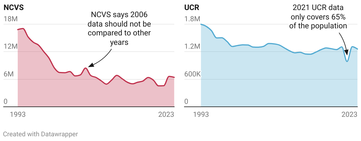 Violent crime counts according to the BJS NCVS and FBI UCR