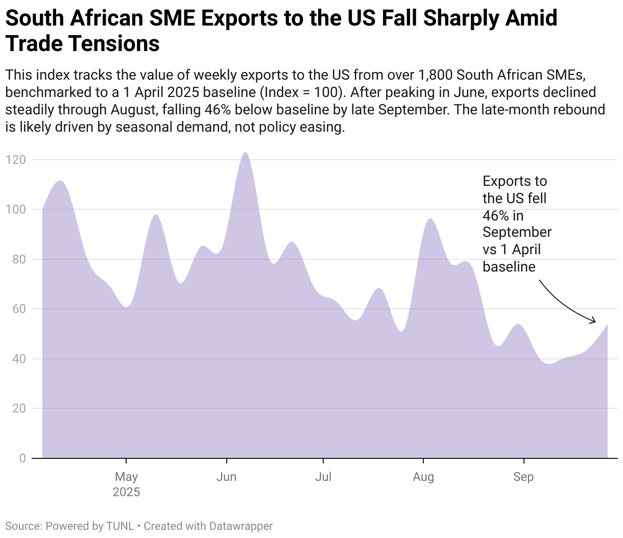 This index tracks the value of weekly exports to the US from over 1,800 South African SMEs, benchmarked to a 1 April 2025 baseline (Index = 100). After peaking in June, exports declined steadily through August, falling 46% below baseline by late September. The late-month rebound is likely driven by seasonal demand, not policy easing.