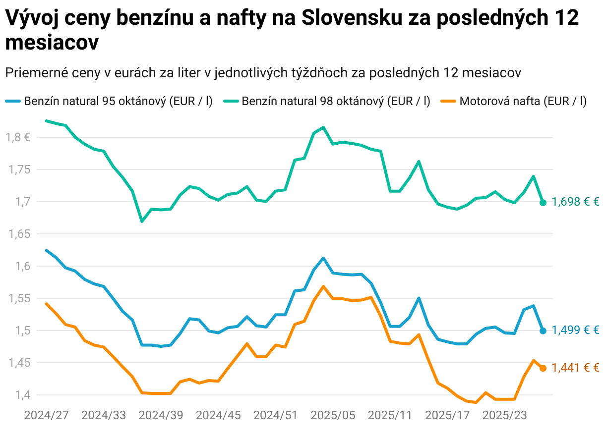 Priemerné ceny v eurách za liter v jednotlivých týždňoch za posledných 12 mesiacov