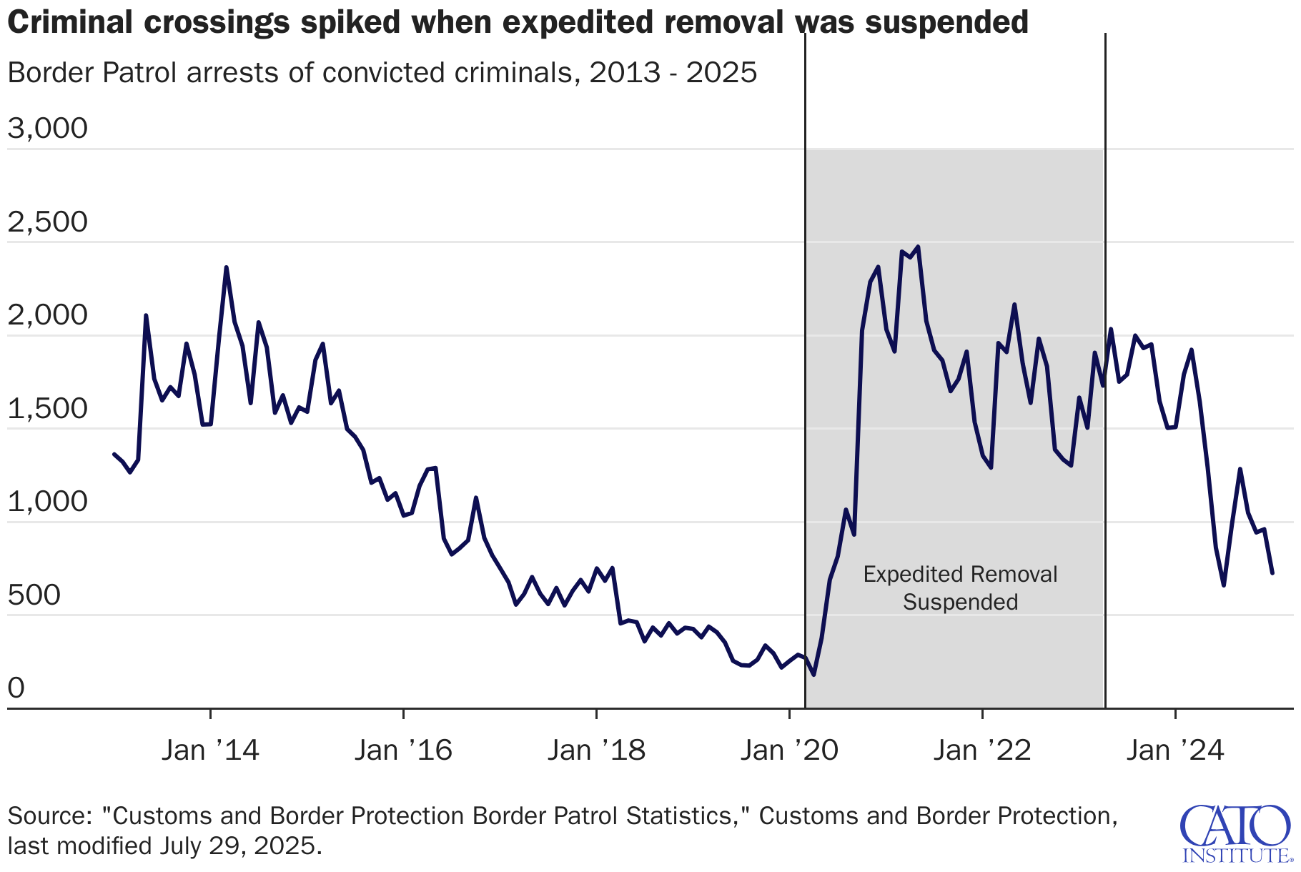 Border Patrol arrests of convicted criminals, 2013 - 2025