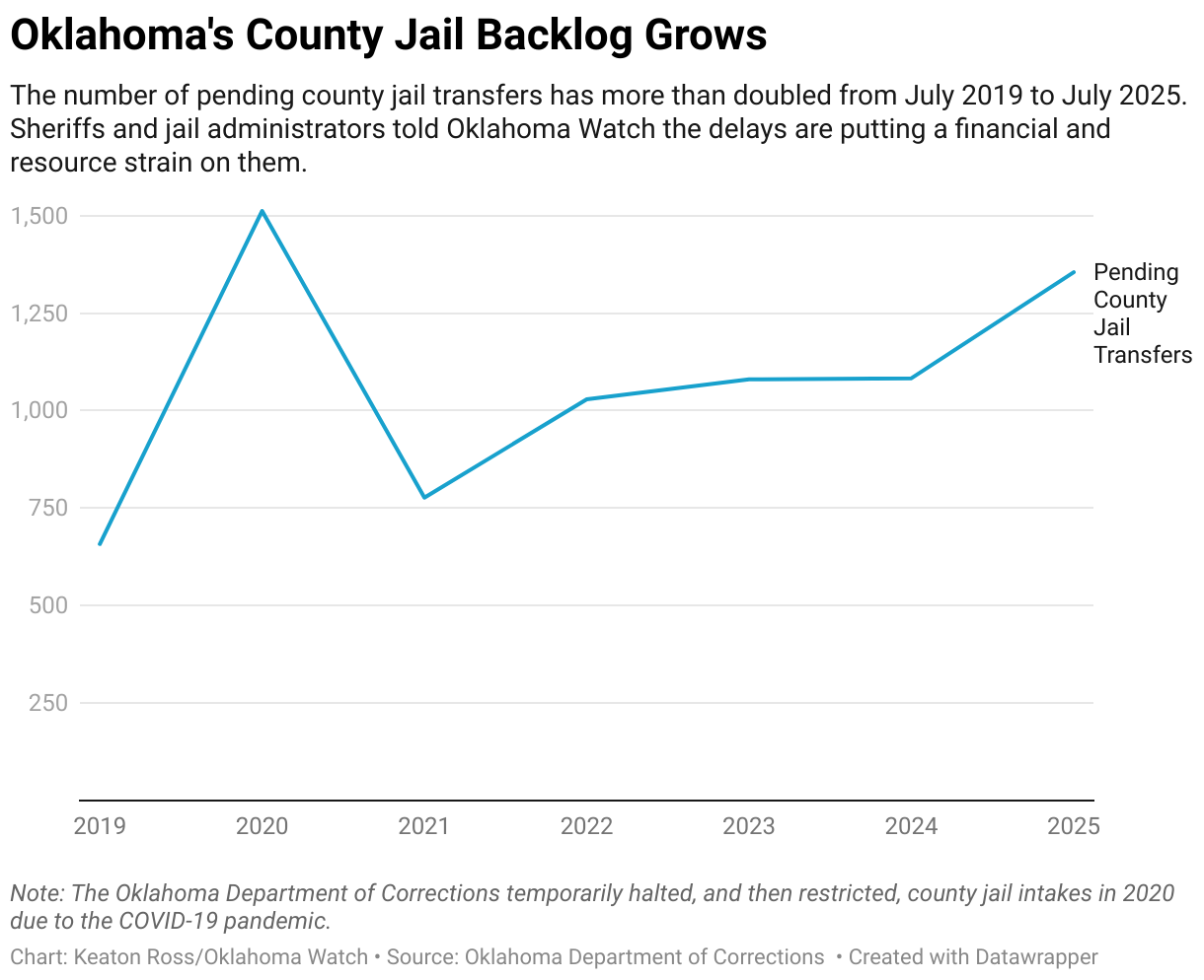 The number of pending county jail transfers has more than doubled from July 2019 to July 2025. Sheriffs and jail administrators told Oklahoma Watch the delays are putting a financial and resource strain on them.