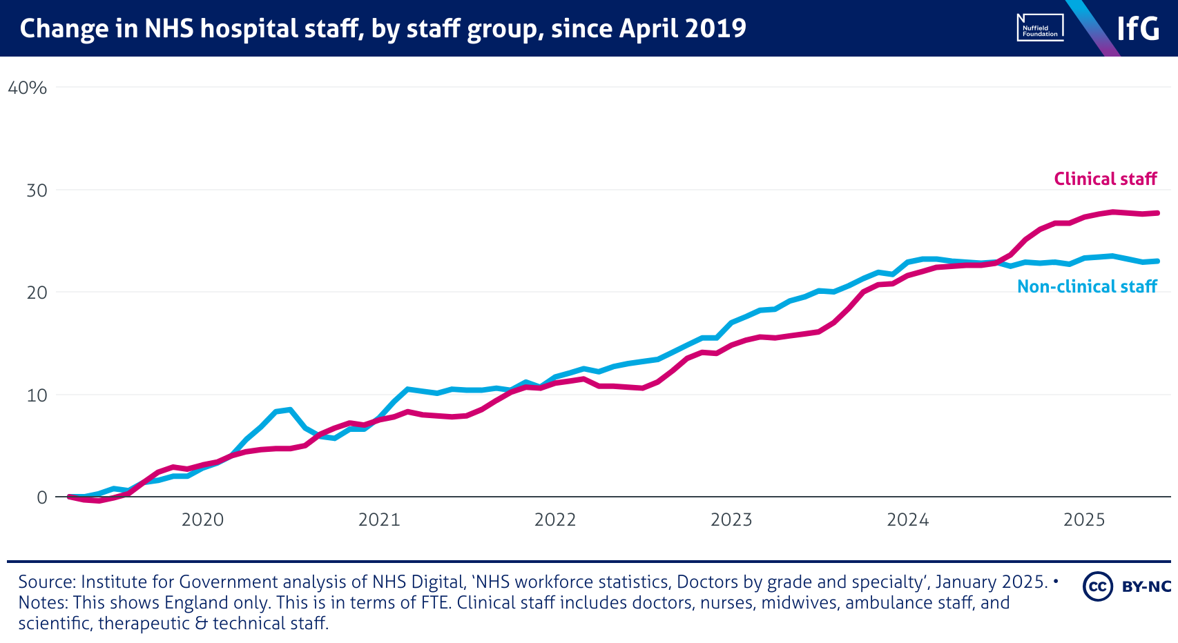 A line chart from the Institute for Government showing Change in NHS hospital staff, by staff group, since April 2019. Both clinical and non-clinical staff numbers have grown steadily, with increases of around 28% and 23% respectively by mid-2025. Clinical staffing grew more rapidly from 2023 onwards, overtaking non-clinical roles in August 2024.