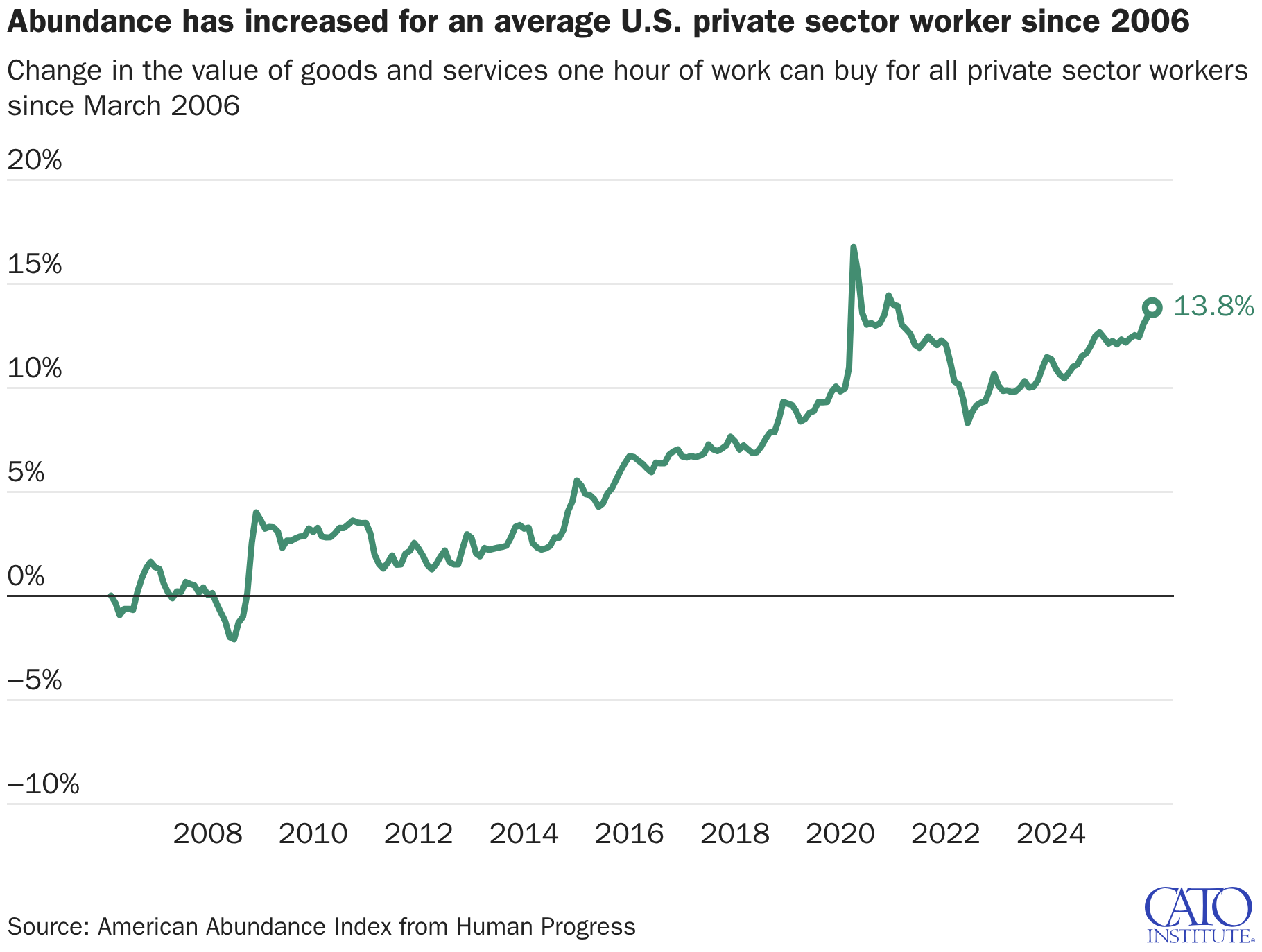 Change in the value of goods and services one hour of work can buy for all private sector workers since March 2006