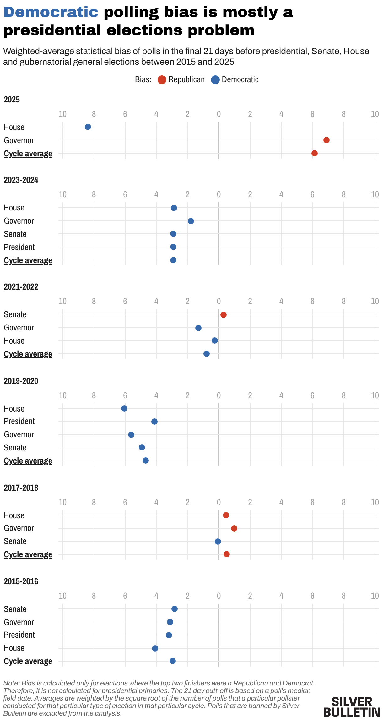 Weighted-average statistical bias of polls in the final 21 days before presidential, Senate, House and gubernatorial general elections between 2015 and 2025