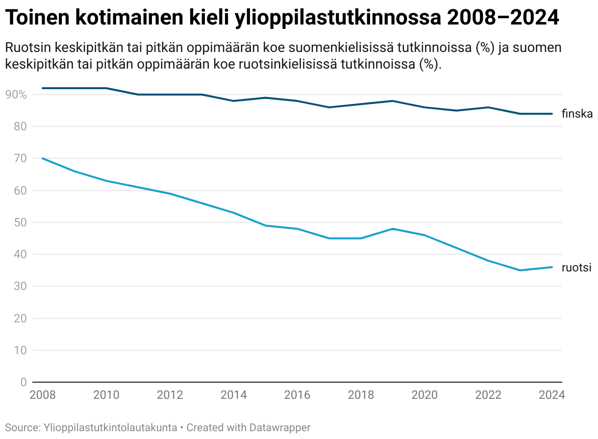 Ruotsin keskipitkän tai pitkän oppimäärän koe suomenkielisissä tutkinnoissa (%) ja suomen keskipitkän tai pitkän oppimäärän koe ruotsinkielisissä tutkinnoissa (%).