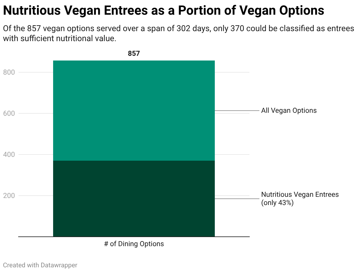 Of the 857 vegan options served over a span of 302 days, only 370 could be classified as entrees with sufficient nutritional value.