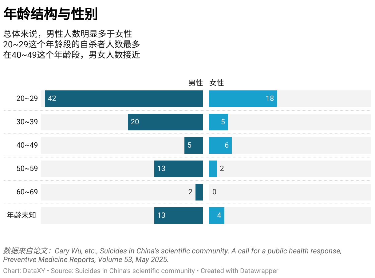 总体来说,男性人数明显多于女性20~29这个年龄段的自杀者人数最多 在40~49这个年龄段,男女人数接近