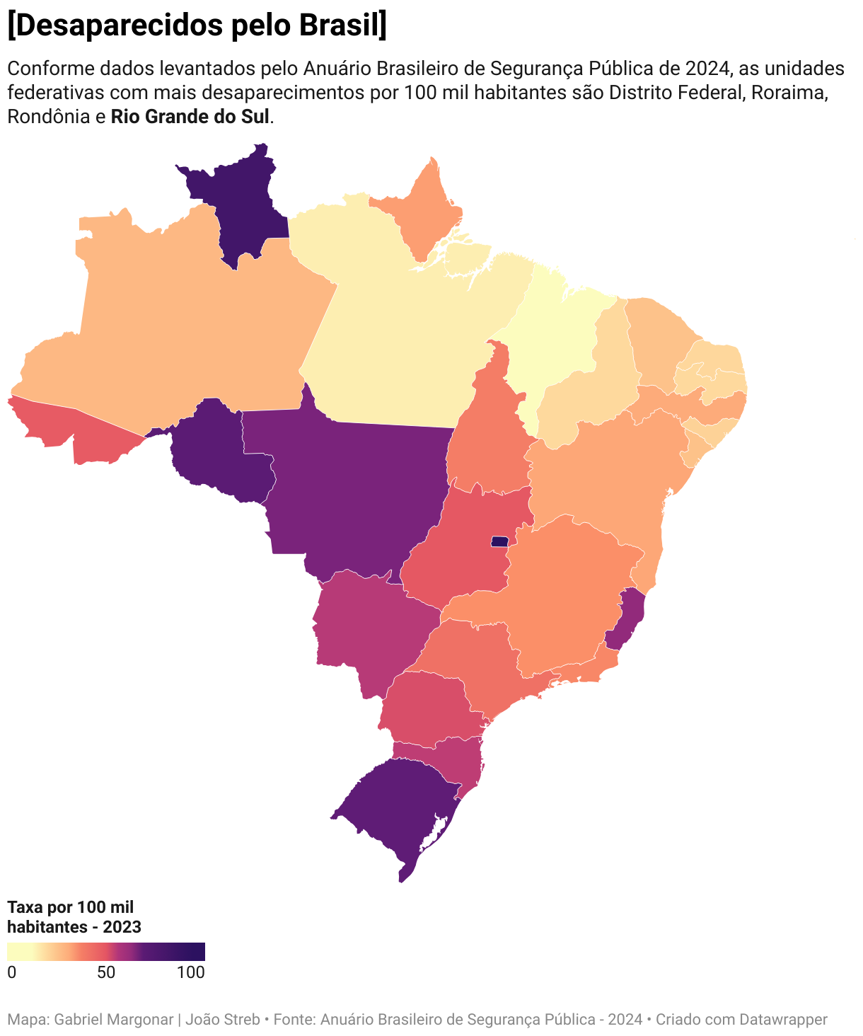Conforme dados levantados pelo Anuário Brasileiro de Segurança Pública de 2024, as unidades federativas com mais desaparecimentos por 100 mil habitantes são Distrito Federal, Roraima, Rondônia e Rio Grande do Sul.