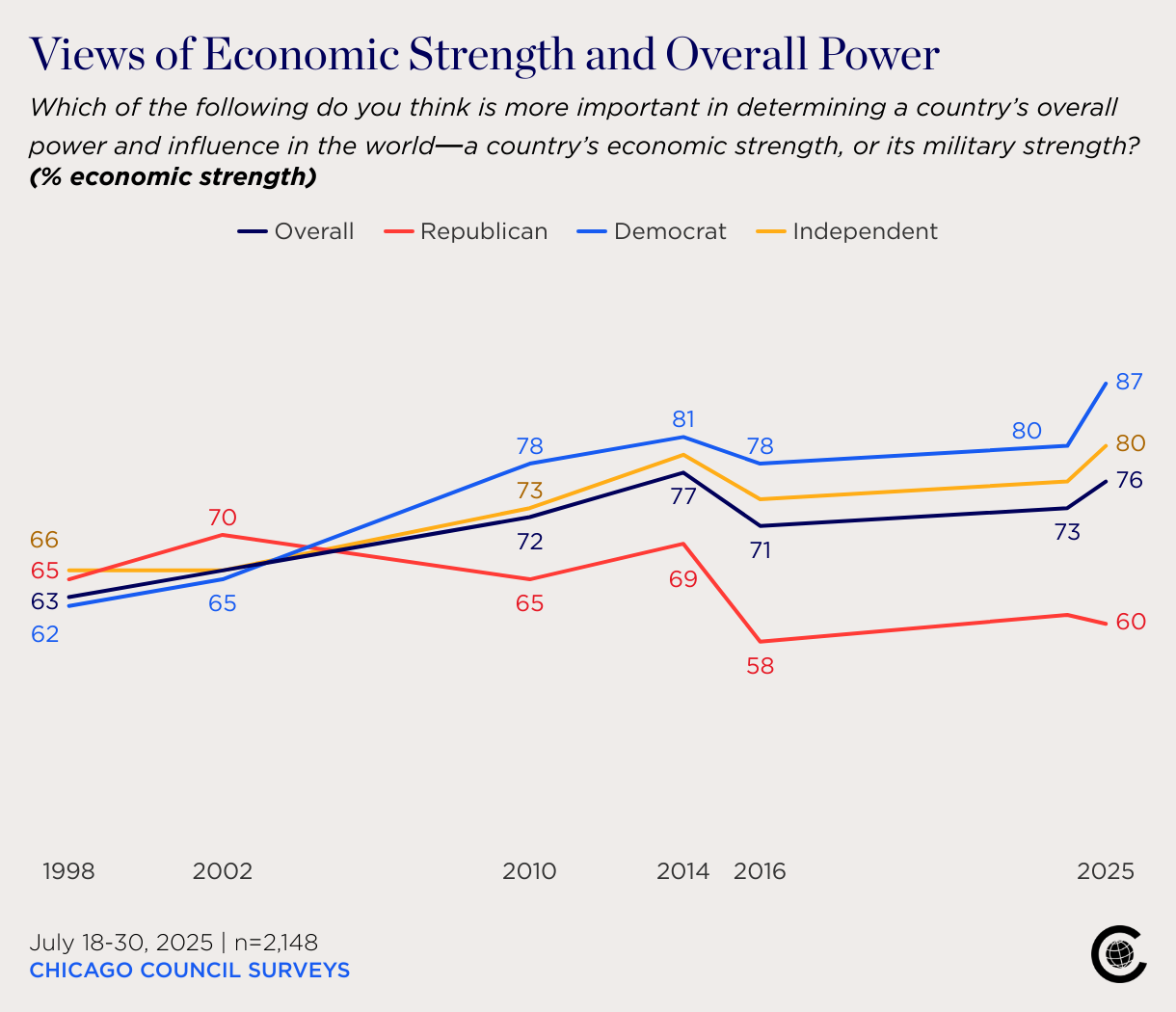 Which of the following do you think is more important in determining a country’s overall power and influence in the world—a country’s economic strength, or its military strength? (% economic strength)