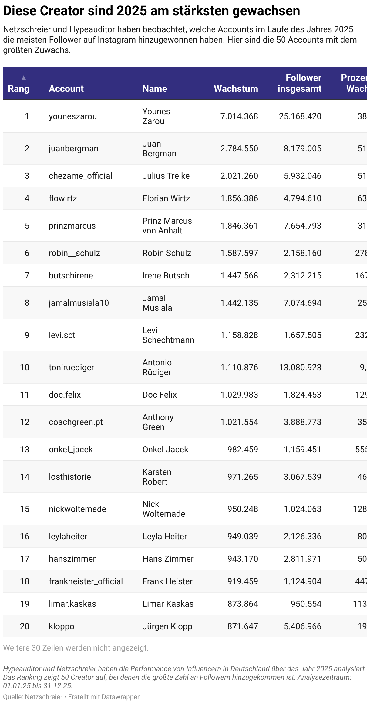 Netzschreier und Hypeauditor haben beobachtet, welche Accounts im Laufe des Jahres 2025 die meisten Follower auf Instagram hinzugewonnen haben. Hier sind die 50 Accounts mit dem größten Zuwachs.