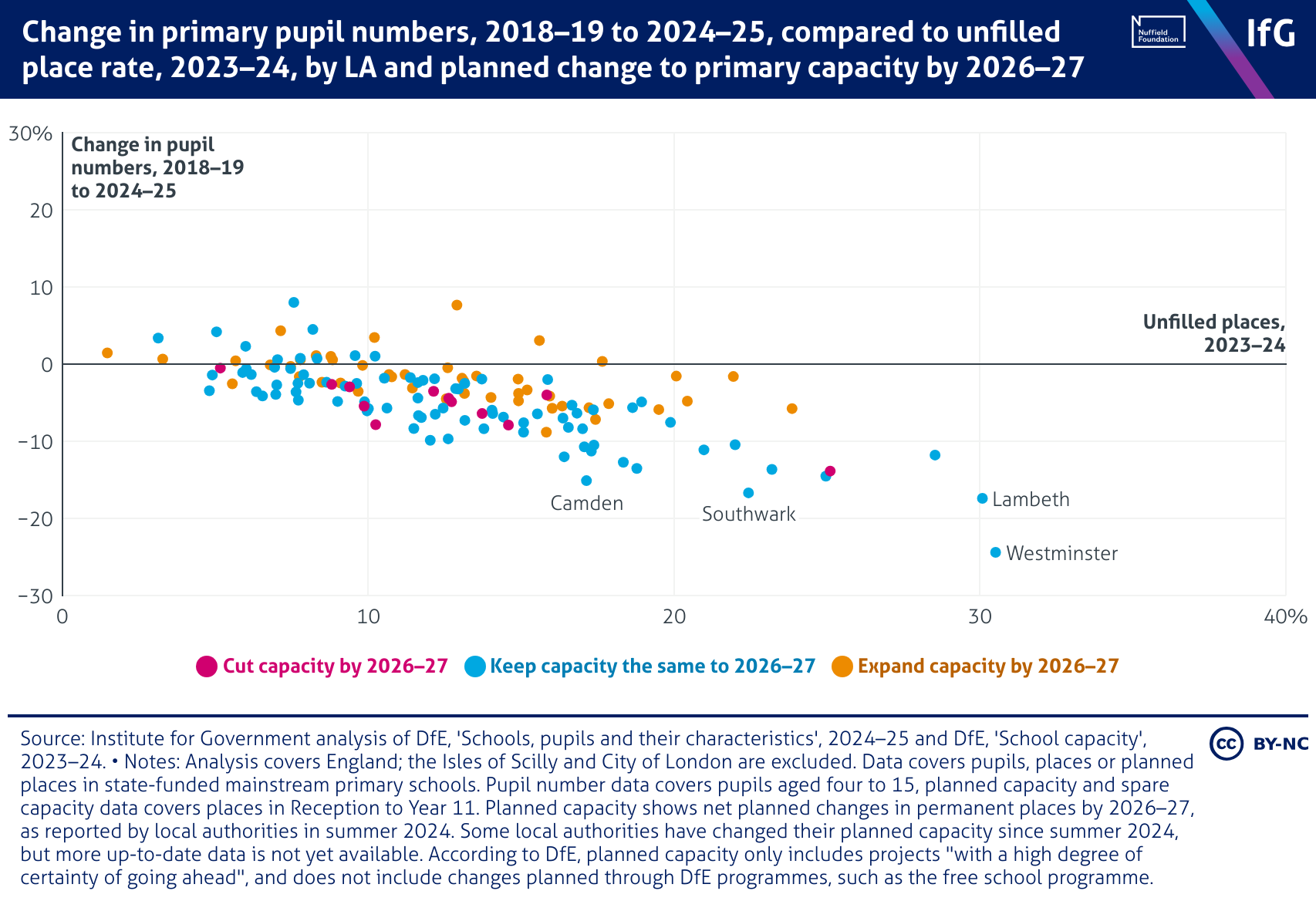 A scatter plot from the Institute for Government of the change in primary pupil numbers, 2018–19 to 2024–25, compared to unfilled place rate, 2023–24, by local authority and planned change to primary capacity by 2026–27. There is no clear relationship among local authorities between those seeing sharp declines in pupil numbers and those with plans to cut capacity by 2026–27 in summer 2024. Several authorities plan to expand capacity, while comparatively few intend to cut it.