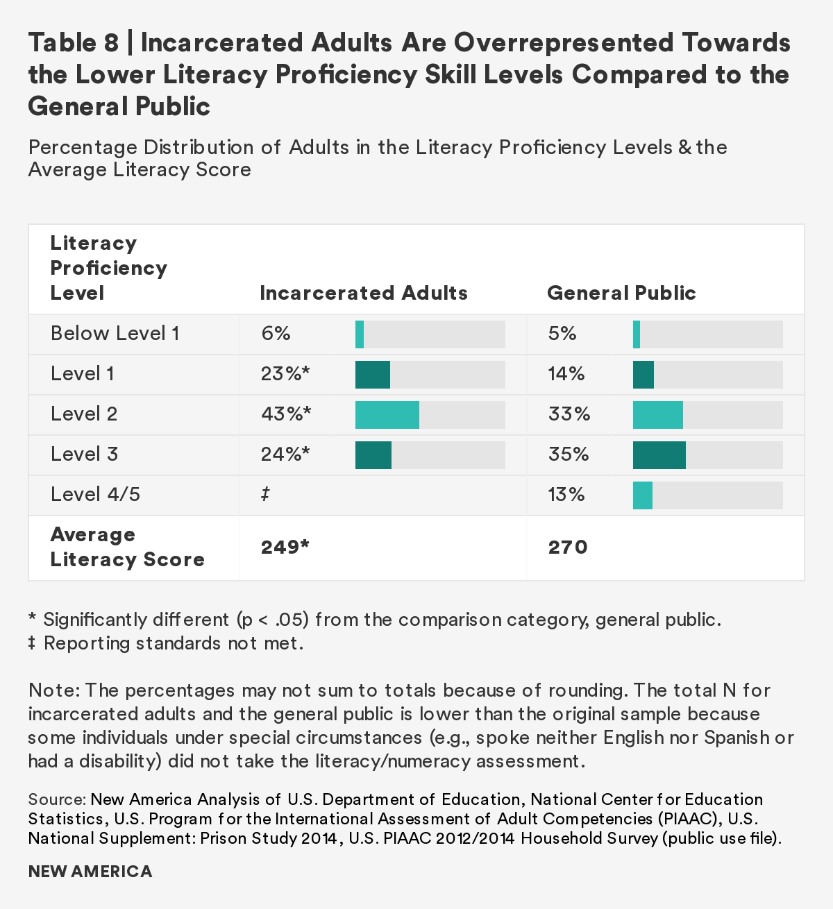 Note: The percentages may not sum to totals because of rounding. The total N for incarcerated adults and the general public is lower than the original sample because some individuals under special circumstances (e.g., spoke neither English nor Spanish or had a disability) did not take the literacy/numeracy assessment.